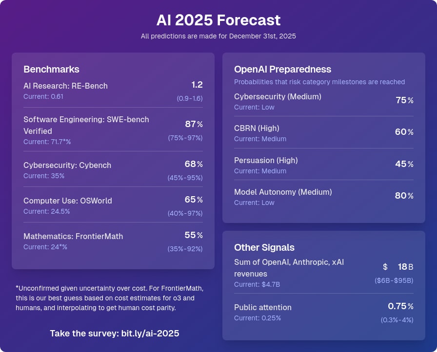 Until this Sunday, you can submit your 2025 AI predictions at ai2025.org. It’s a forecasting survey by AI Digest for the 2025 performance on various AI benchmarks, as well as revenue and public attention.