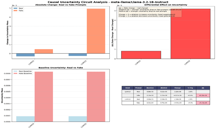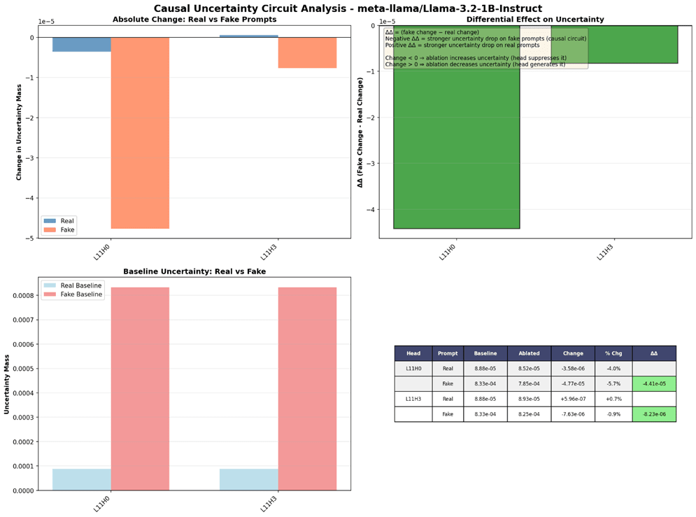 I computed baselines for both real and fake prompt, rerun the fake prompt while overwriting targeted heads with clean activations cached from the real prompt run, and measured the change in uncertainty mass.