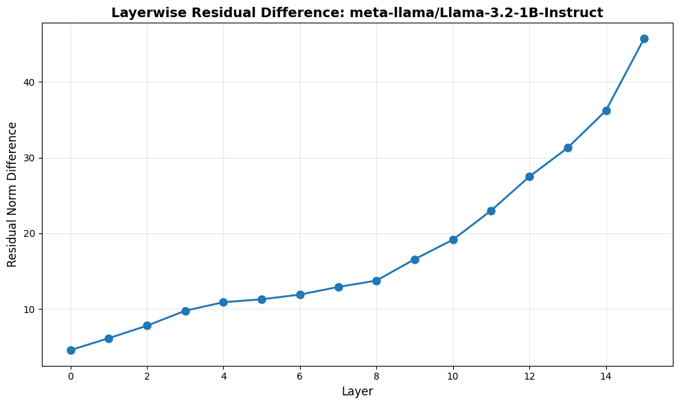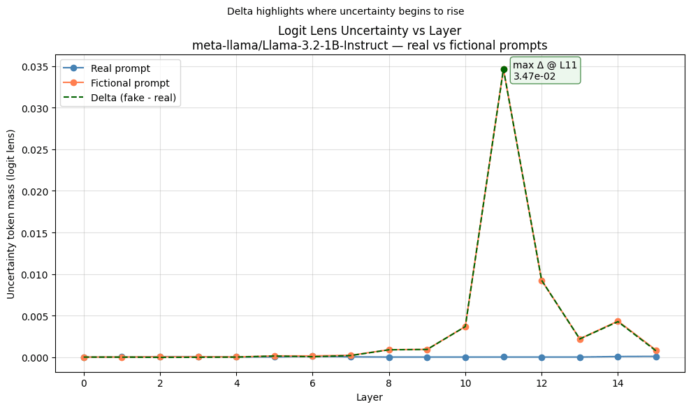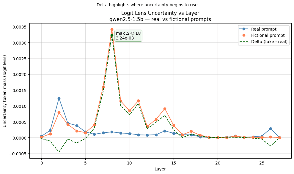 Both of these model have uncertainty spiking in one layer with smaller spikes nearby, which is then suppressed afterwards in downstream layers. Also the localization depends on the model as uncertainty is concentrated in later layer in Llama-3.2-1b-Instruct and in qwen-2.5-1b-Instruct it is sparse in early-middle layers. In qwen, there is some uncertainty in real prompt also in early layers.