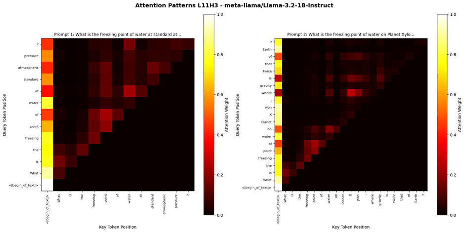 Left / Real prompt has a strong diagonal, head behaves normal, whereas in Right / Fake prompt the diagonal is weaker, head is diverting towards fictional tokens.