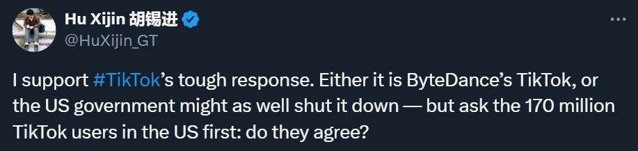 Also some noted that TikTok is trying to challenge Amazon, and trying to launch TikTok Shop as a shopping destination, currently selling on the order of $7 million a day. Amazon has limited presence in China. It is not outright banned, but no doubt China would not allow it to gain the kind of key role that it has in America, or even a fraction of that. Also no one is saying ByteDance can’t have an e-commerce business?