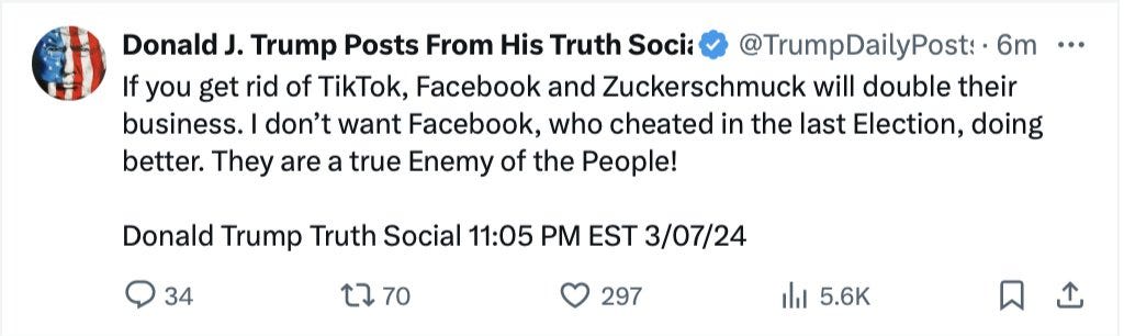 Donald Trump met with billionaire investor and Club for Growth donor Jeff Yass, who holds a 15% stake in ByteDance. Shortly after, Trump started opposing the ban, despite having previously actually issued an order requiring divestiture back in August 2020, which Biden reversed while it was stalled under legal challenges.