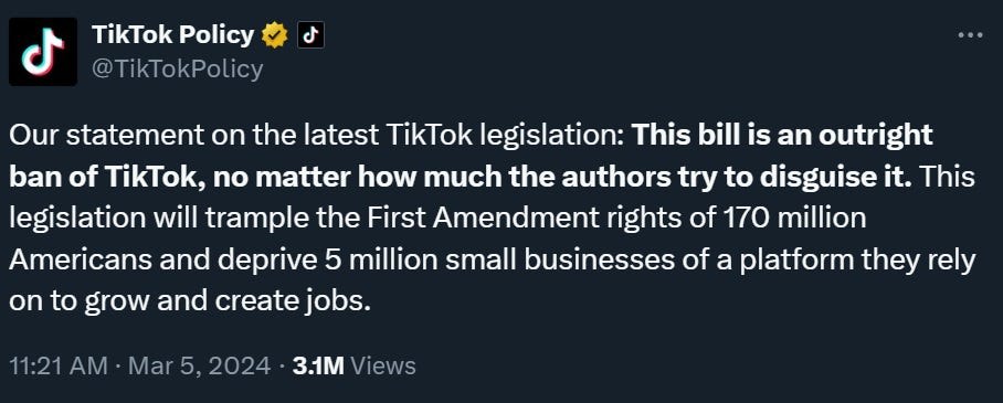 Is this bill a ban on TikTok, or merely a forced divestiture? A forced divestiture can still deny quite a lot of value, you were not previously planning to sell and now buyers have you over a barrel, but they are still very different things.