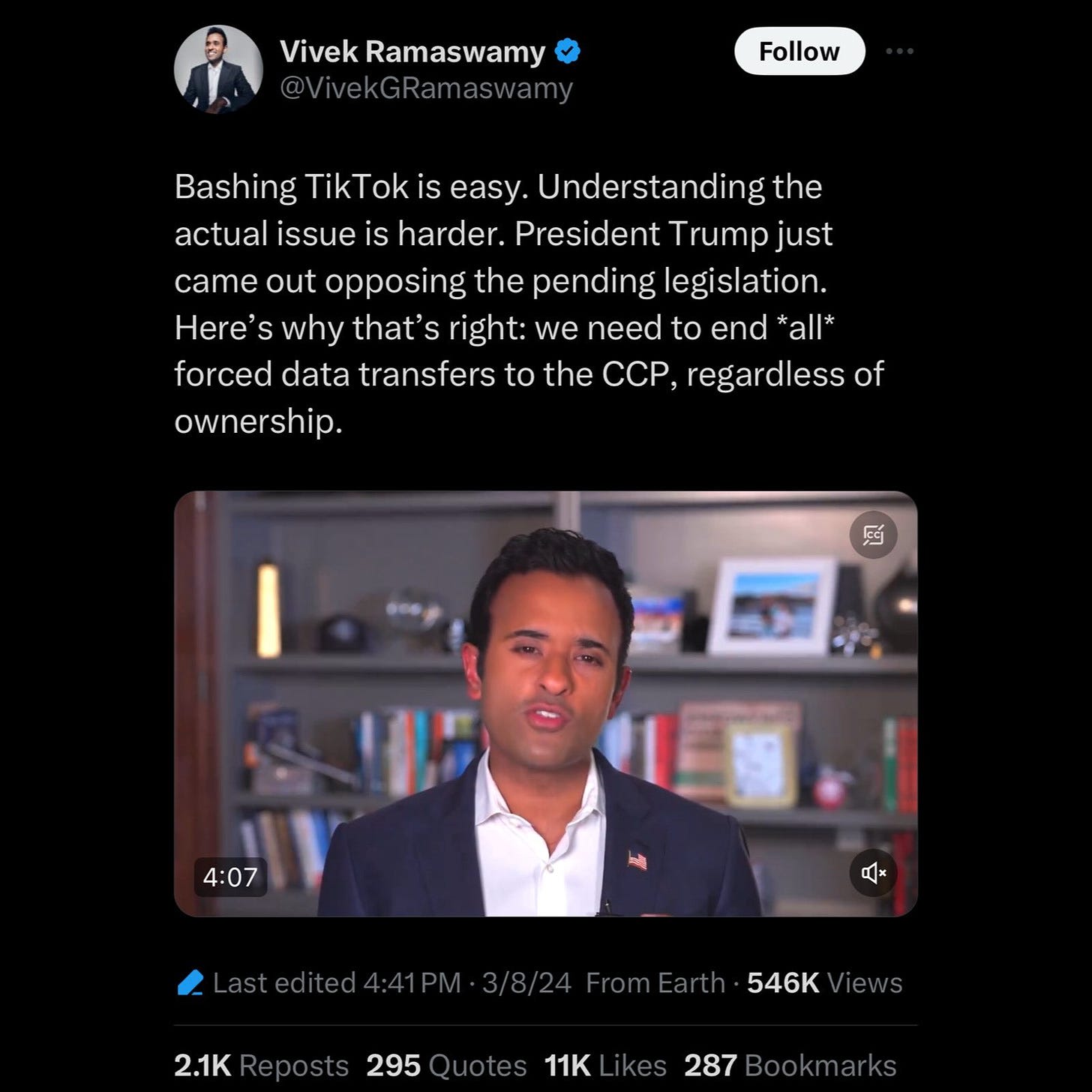 That seems like a deeply silly argument. If you want something even broader, then propose something even broader. I don’t even know what ‘ban all data transfers’ would mean in practice if it wasn’t a ban on Chinese companies doing business at all, and neither does Vivek. Nor is he making a case that this bill is negative on the margin, which is the question that matters.