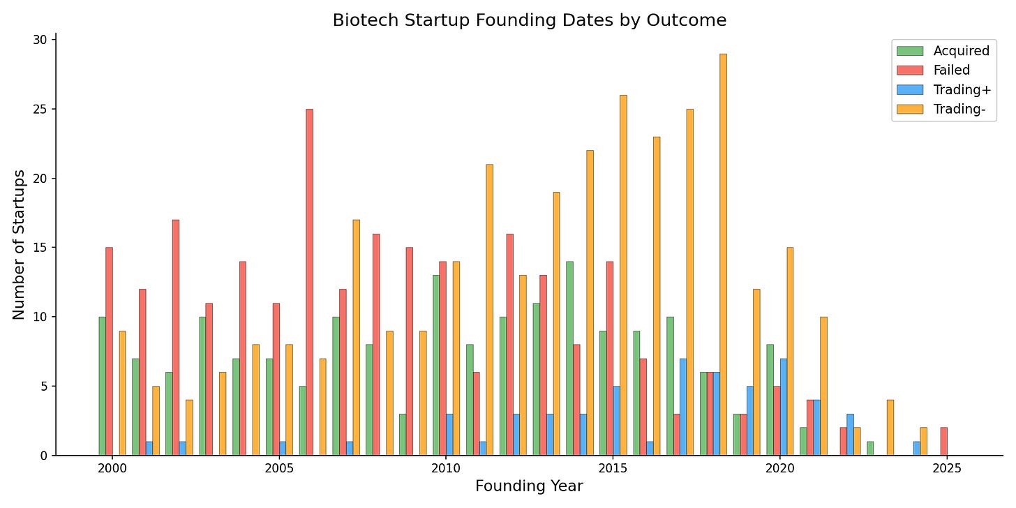 One thing these stats aren’t very informative about is very recent trends. Anything that’s mostly happening in pre-IPO companies isn’t in this dataset, and the most recently-IPO’d companies are too young to really have outcomes. So, “should you continue betting on these trends or are they played out?” is something you’d need more domain expertise (and a bit of luck) to assess.