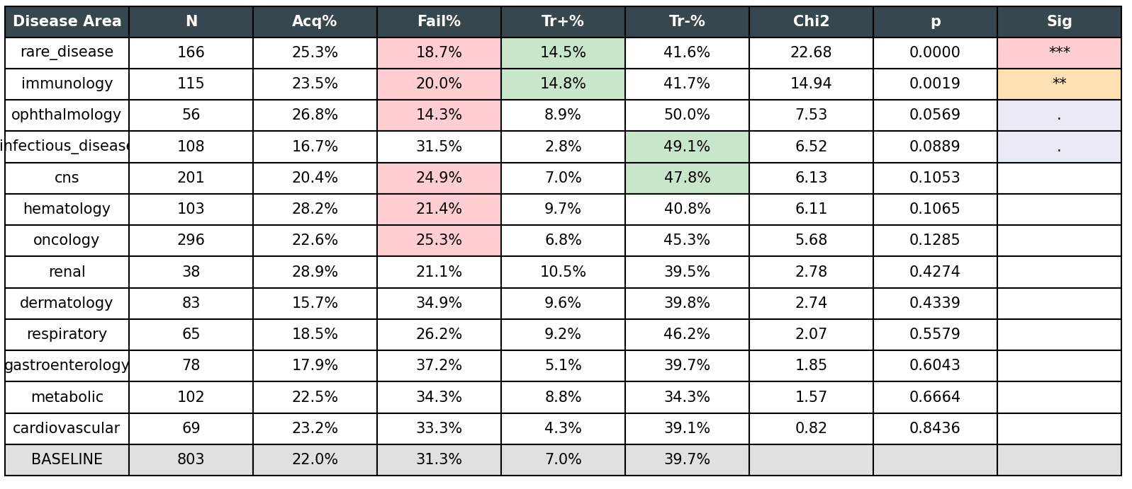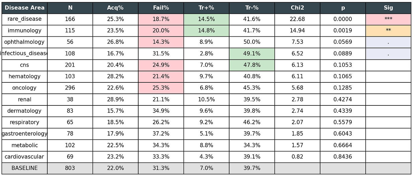 Rare diseases and immunology are good (less likely to fail, more likely to have positive CAGR).