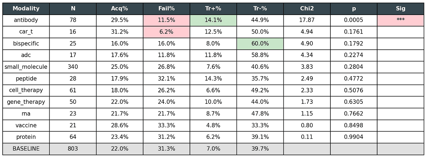 I’m mildly surprised that cell therapies, CAR-T, and peptides aren’t outperforming the baseline, despite conventional wisdom being that some of these novel biologic modalities are “the way of the future.” Maybe it’s still too soon to tell, or maybe exciting science hasn’t translated sufficiently into financial returns.