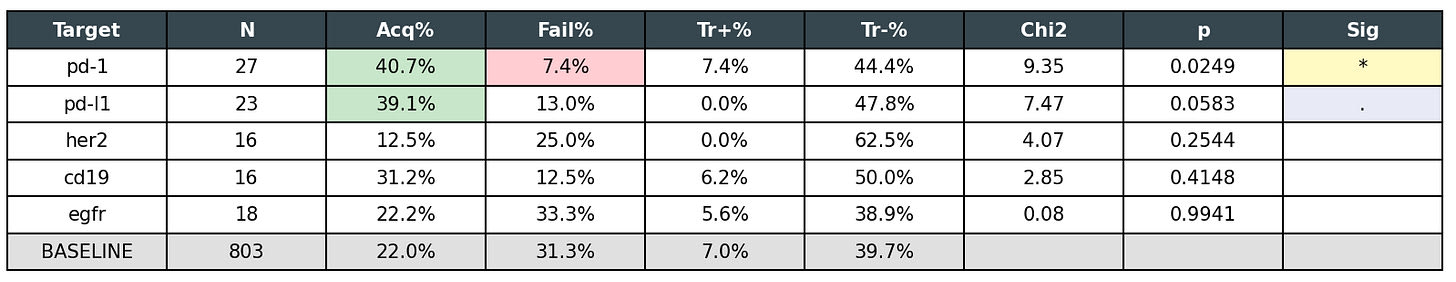 And PD-1 (the target of immune checkpoint inhibitors for cancer) is by far the best target (more likely to be acquired, less likely to fail.)