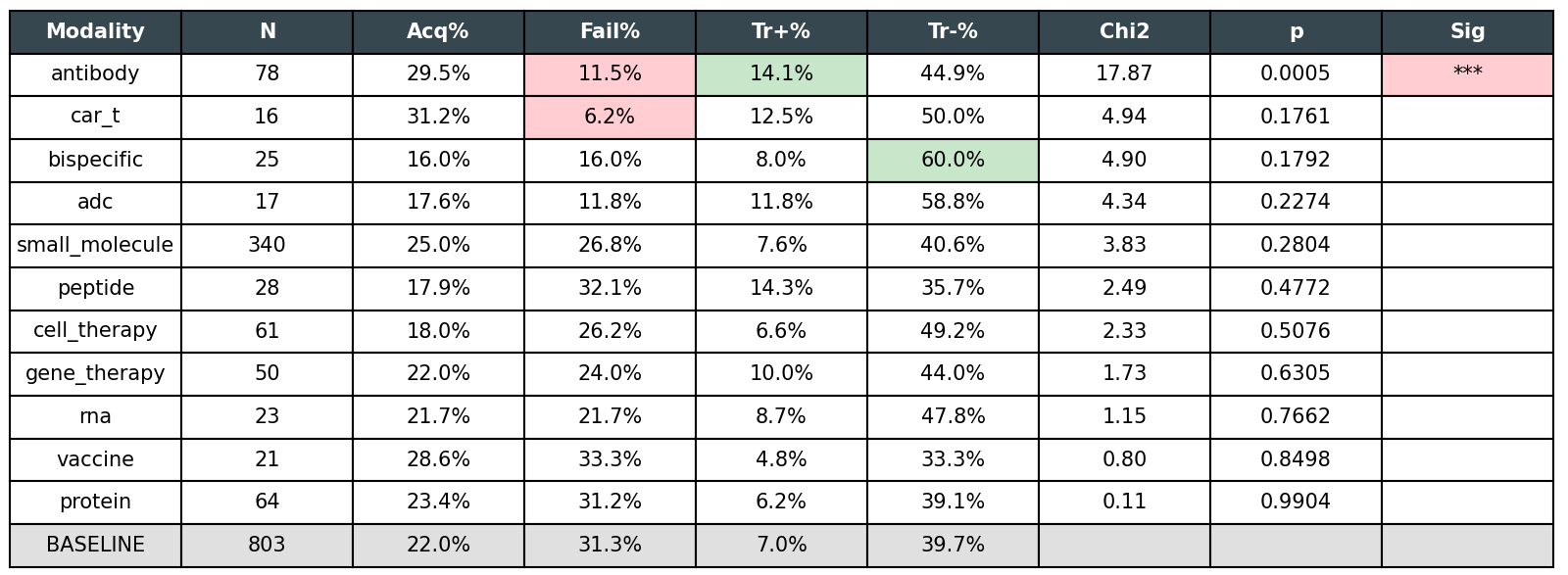 and modality sub-type (biologics can include peptides, oligonucleotides, antibodies, vaccines, etc; “other” can include natural products, radiotherapies, drug formulations, etc)