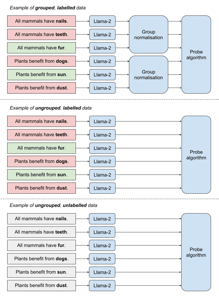 Grouped algorithms utilise “groups” of statements to build the probes. For example, all possible answers to a question (true/false, A/B/C/D) constitute a group. Using this information should allow the probe to remove noise from the representations.