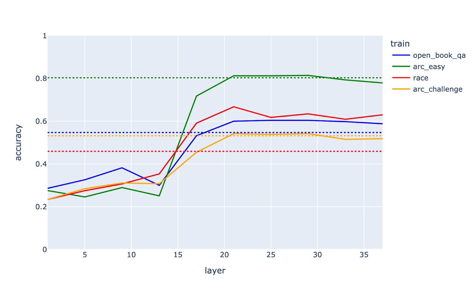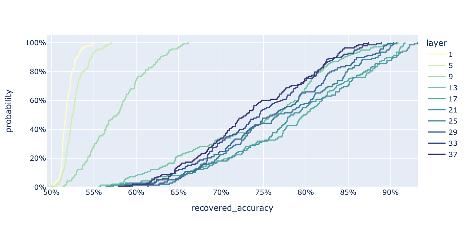 Let’s dig a bit deeper into our best probe. We vary each of the three hyperparameters (algorithm, train dataset, and layer) individually. This shows that the probe isn’t too sensitive to hyperparameters, as other choices perform nearly as well.