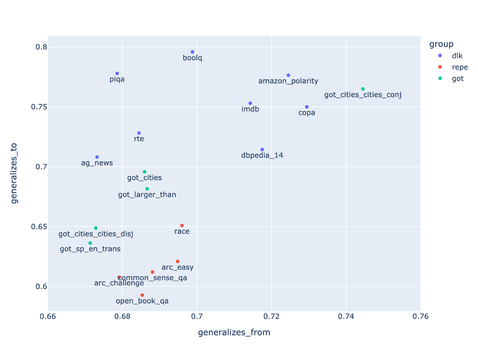 We measure generalisation by seeing how well probes trained on one dataset generalise to other out-of-distribution datasets. For example, we train a probe on whether a news article is about business or sports (ag_news) and see how well it performs when detecting if numbers are bigger or smaller than each other (larger_than). We use 18 diverse datasets.