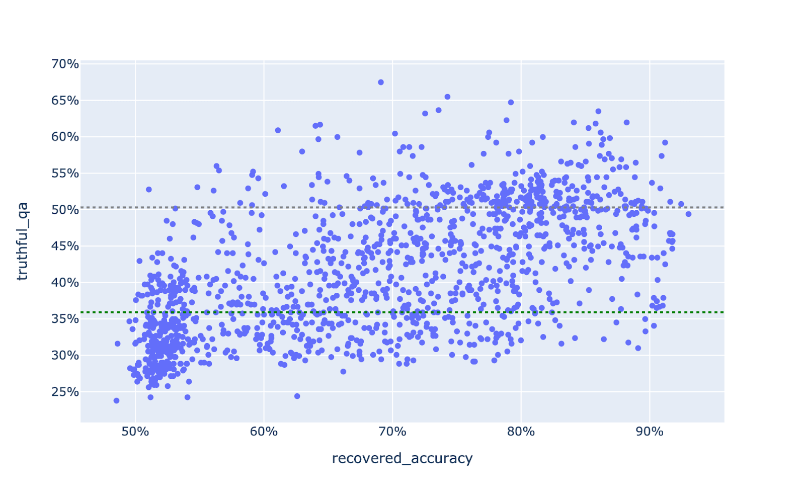 While probes on early layers (<=9) perform poorly, we find that for mid-to-late layers (>=13) 36% of all probes recover >80% accuracy. This is evidence in favour of a single generalised truth notion in Llama-2-13b-chat. However, the fact that we don’t see 100% recovered accuracy in all cases suggests that either (1) there is interference in how truth is represented in these models, and the interference doesn’t generalise across datasets, or (2) truth is in fact represented in different but highly correlated ways.
