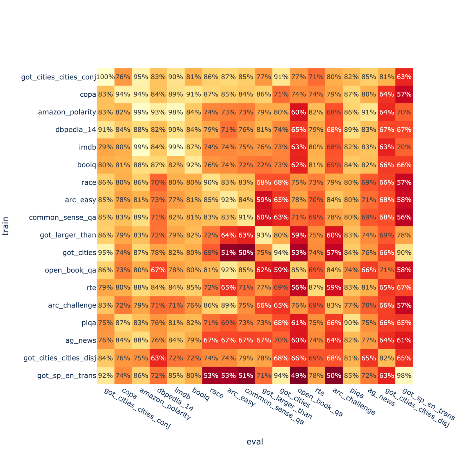 We can also plot a “generalisation matrix” showing how well each dataset generalises to each other dataset.
