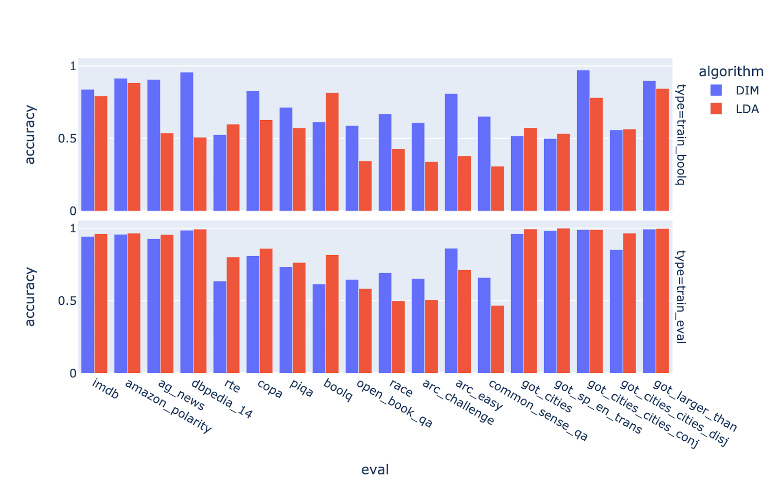 Above, the LDA probe performs poorly. This hints at a bug. However, our implementation simply calls out to scikit. We also find that the probe performs better than LDA in-distribution, but worse out-of-distribution: