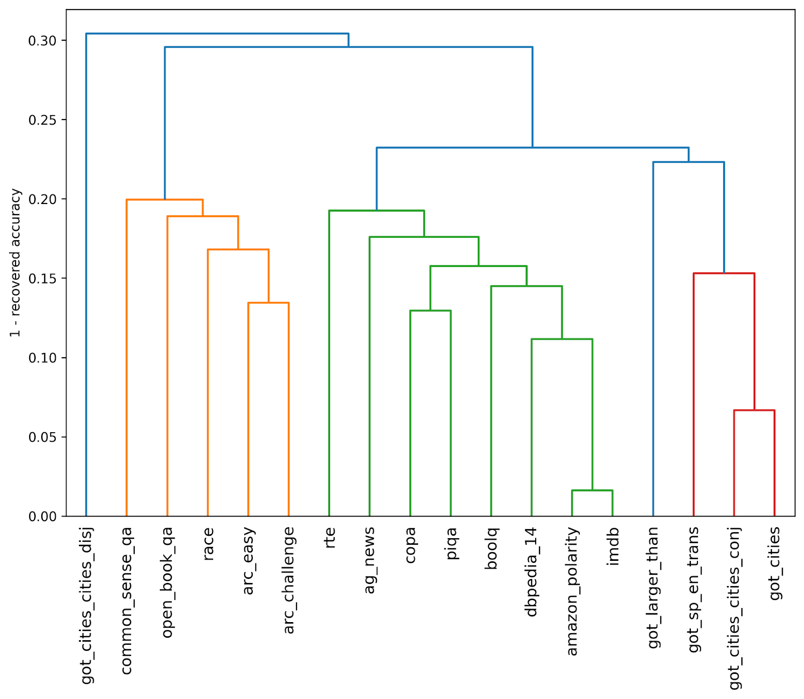 There seems to be some structure here. We explore further by clustering the datasets, and find that they do form DLK, RepE, and GoT clusters: