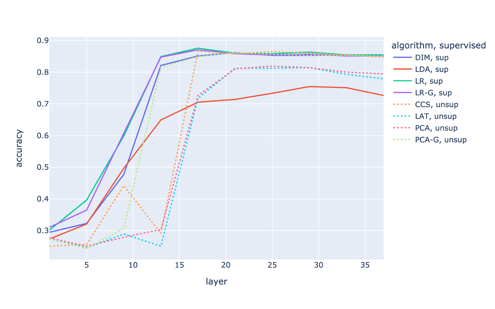 Supervised algorithms use the true/false labels to discover probes. This should allow better performance when truth isn’t salient in the activations. However, using supervised data encourages the probes to predict what humans would label as correct rather than what the model believes is correct.