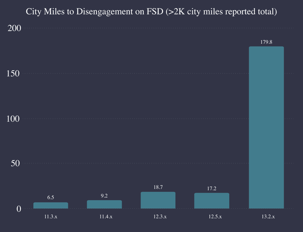 Full self-driving living up to its name far more than it used to, with disengagements down 750% in Tesla version 13.2.x. There’s a huge step change.