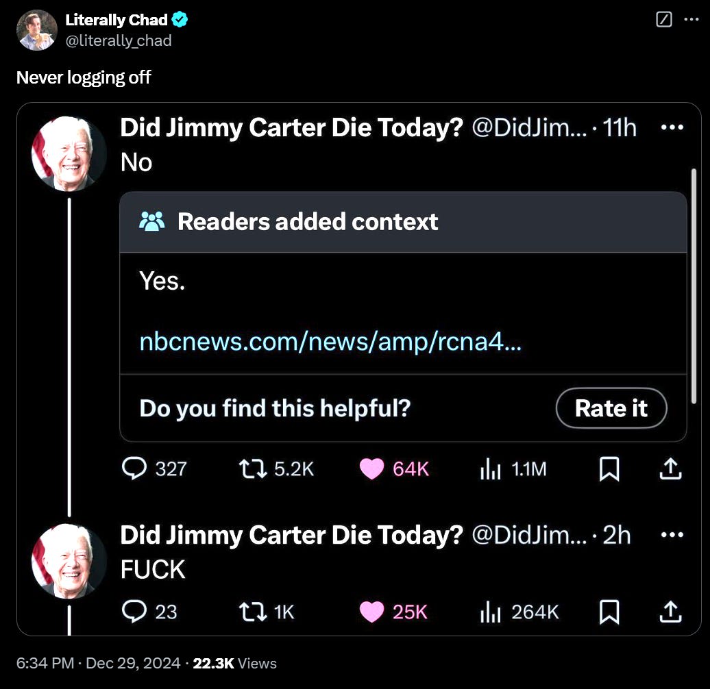 If Carter killed it on foreign policy and peace, and killed it on being moral and standing up for what is right, and killed it on monetary policy and deregulation as a Democrat when we desperately needed both, and you realize this, then I don’t care if the vibes are off. That’s amazing. You better recognize.