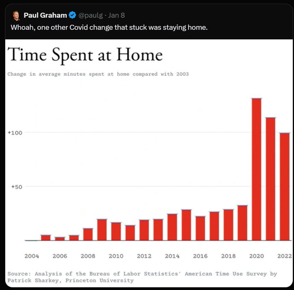 I often find the insinuations people make with this graph to be misleading. The increase in time spent at home is in very large part due to the rise in remote work, which I would say is a public good (and at least for me, leads to much easier high quality socialization, as I can make my schedule work for my friends). Additionally. time spent not at home includes people commuting, with all of the negative internalities (risk of crash, wasted time, etc) and negative externalities (emissions, greater traffic load, etc) that driving includes.
