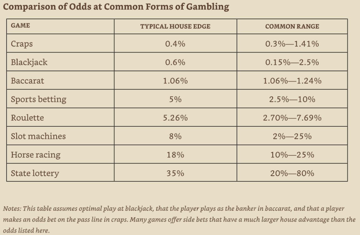 Note on sports betting: This assumes random betting on a -110 line. You can do much worse if you use parlays or props, or you can actively win if you’re good enough, and quick line shopping helps a lot (probably takes you from -5% to about -2%).
