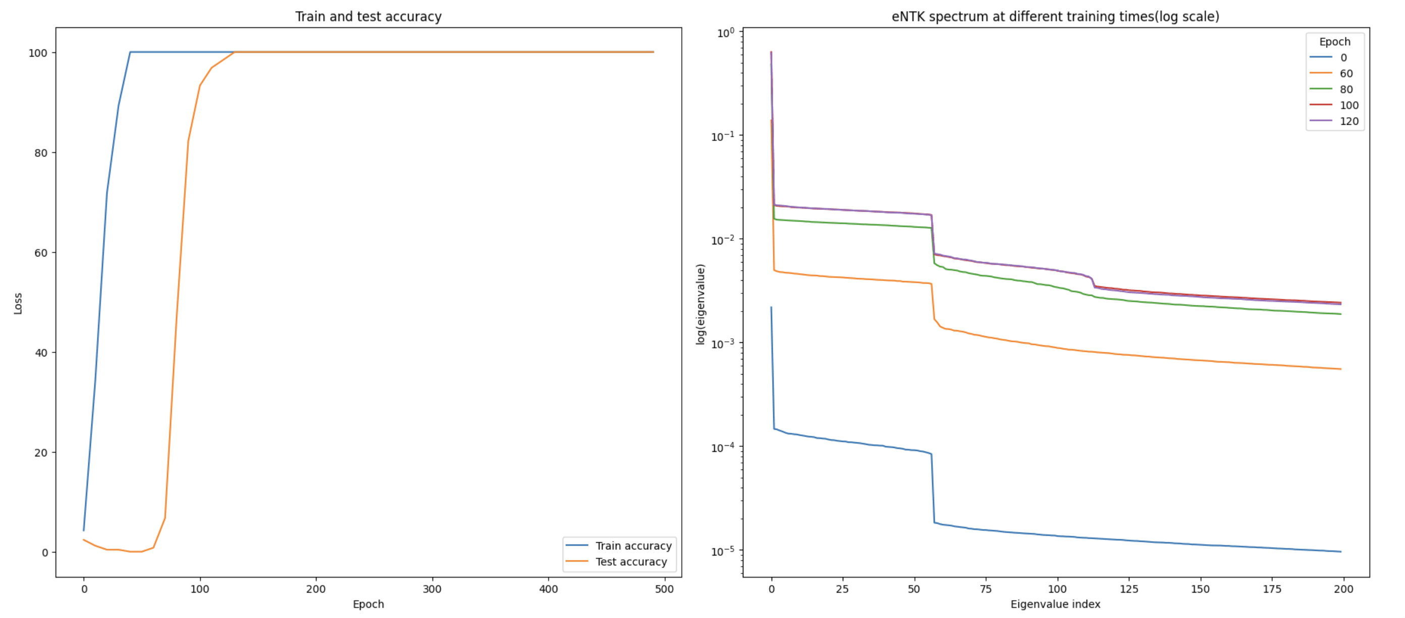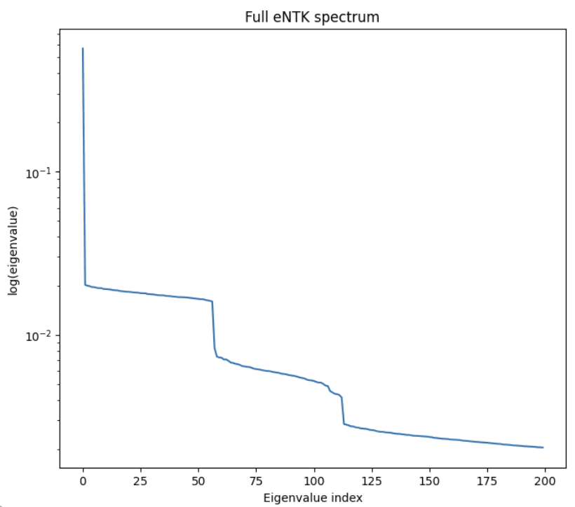Looking at the time evolution of the spectrum, we find that the first cliff already exists at initialization (!) - suggesting that we could perhaps have predicted the use of Fourier features at initialization using the eNTK - while the second appears at the same time as the grokking phase transition. [8]