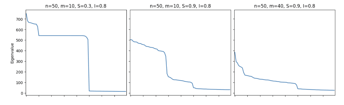 In "Toy Models of Superposition," we find that for models with ground-truth features and importance hyperparameter , across varying sizes of the hidden layer and values of the sparsity hyperparameter , the (flattened [4]) eNTK eigenspectrum contains two cliffs that track (1) the number of features the model is able to reconstruct and (2) the total number of ground-truth features.