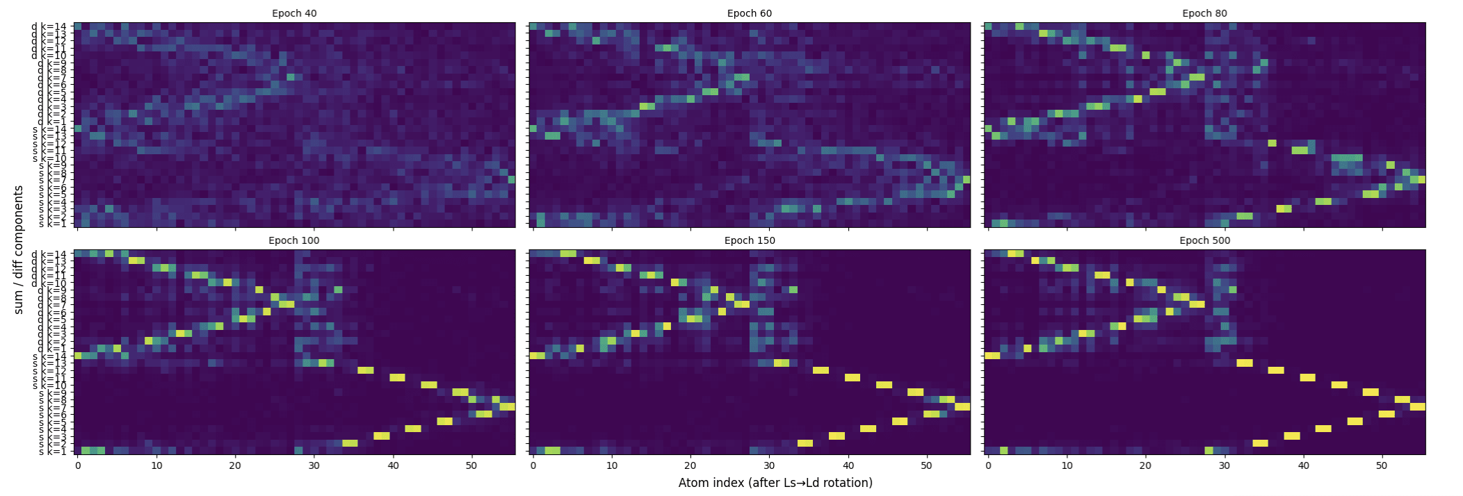 Moreover, we show that beyond having the correct counting, the eNTK eigenvectors in each cliff specifically coincide with a pair of Fourier feature families. In the paper, we show that a rotation of the eigenvectors in each cliff motivated by symmetries of the dataset causes the eigenvectors in the first cliff to line up with the '' and '' Fourier feature families, and those in the second cliff to line up with '' (sum) and '' (difference) Fourier feature families, for the two inputs to the arithmetic problem.