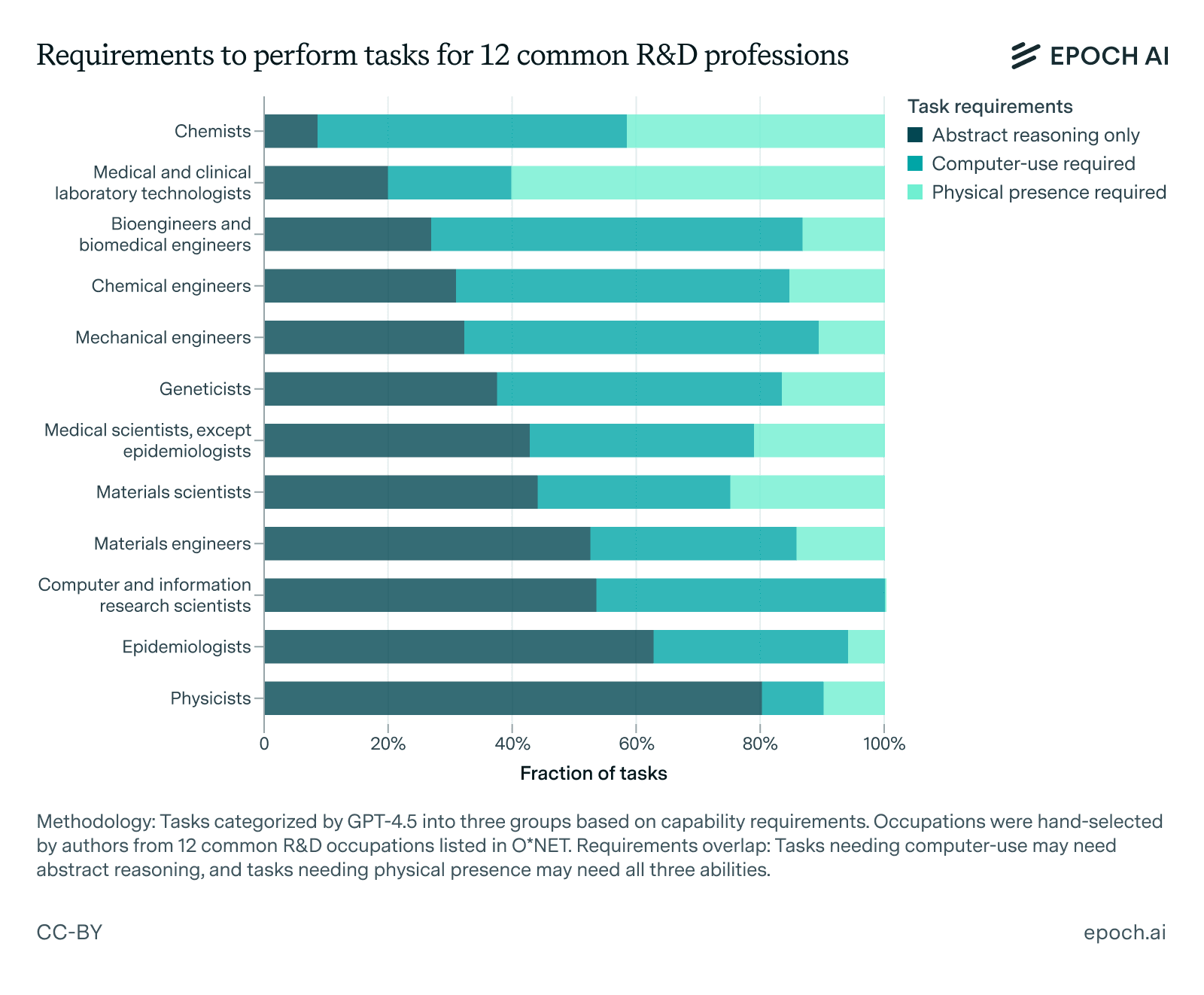 But this picture is likely wrong. In reality, most R&D jobs require much more than abstract reasoning skills. ... To demonstrate this, we used GPT-4.5 to label tasks across 12 common R&D occupations into one of three categories, depending on whether it thinks the task can be performed using only abstract reasoning skills, whether it requires complex computer-use skills (but not physical presence), or whether it one needs to be physically present to complete the task. See this link to our conversation with GPT-4.5 to find our methodology and results.
