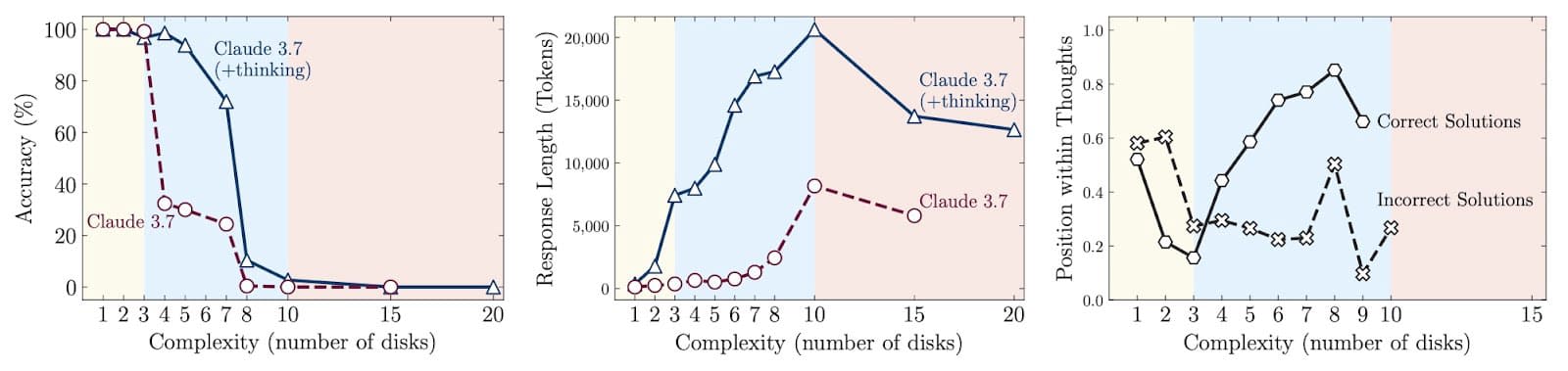 Research findings revealed a complete performance collapse in all the reasoning models after reaching a certain complexity. It also identified three different “performance regimens”: on simple tasks, non-thinking LLMs outperformed their thinking counterpart; on medium complexity tasks, thinking models started to show a glimpse of advantage; but when reaching high-complexity tasks, both models failed completely. An “overthinking phenomenon” was also observed, where LRMs often identified the correct solution early, yet continued exploring incorrect alternatives which led to excessive compute costs; counterintuitively, when approaching the highest complexity, models tended to “stop thinking” although still having the resources to keep reasoning.