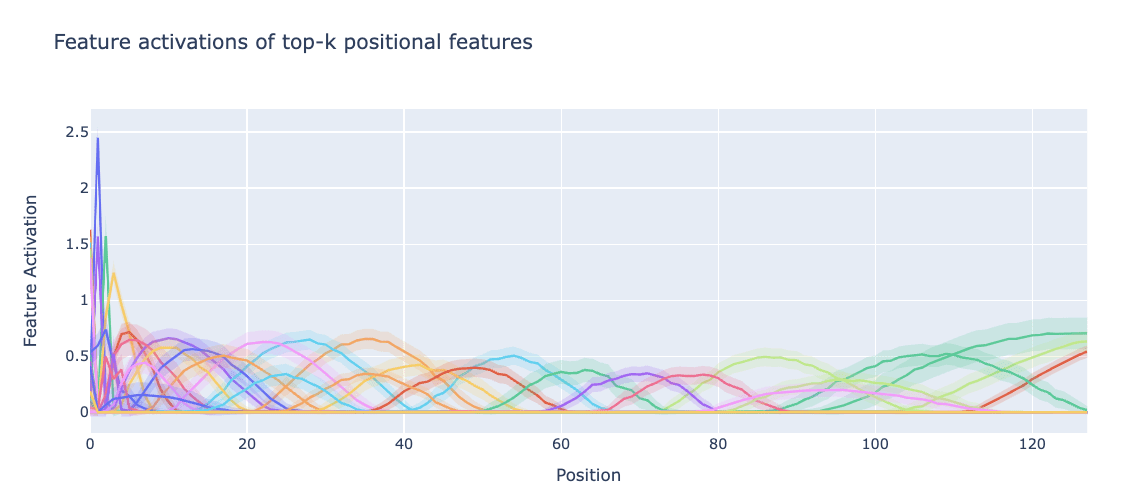Many positional features, each with small standard deviation over input tokens (shown in lower opacity below, indicating they really are true positional features). These span the entire context length.