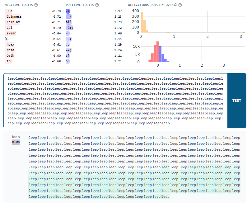 Additionally, features that did not fire for small positions also suddenly start firing as the position is increased. The SAE thinks tokens are present which are not. We can easily validate this in neuronpedia. Here’s a feature that “should” fire on arrows (e.g. “->”). However, it It also fires on the word “leep” late in the context, making the SAE "think" there are arrows present.