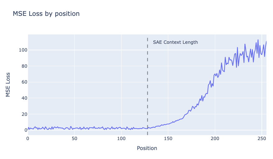 It has beenobserved that SAEs sometimes break out of the training context length of activations they were trained on. In particular, the reconstruction error blows up. Note that the reconstruction error is significantly worse than what one would obtain by randomly reconstructing a vector of similar norm.