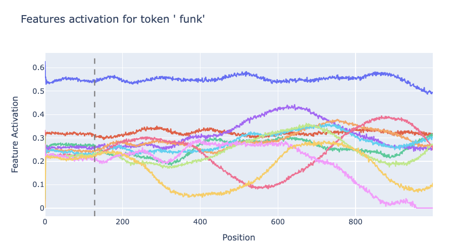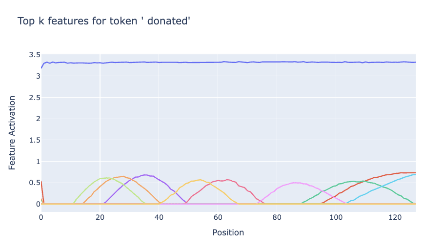 Semantic features are relatively well studied, so we only briefly study them here. In particular, we can find the most important features for a given token by assigning token scores for each feature for a particular token by instead taking the mean over all positions. Below we plot the top-k features for a particular token. We generally find that for a fixed token there are some strong/weakly activating token dependent features (horizontal lines), and a set of lower magnitude position dependent features (bumps) that fire conditional on the sequence position.