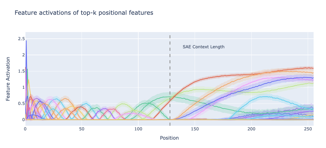 Positional features are trained on short contexts, and overfit to them. This plot suggests that at late positions the SAE “thinks” that it is at significantly earlier positions, as each feature in the training distribution only corresponds to a highly local region.