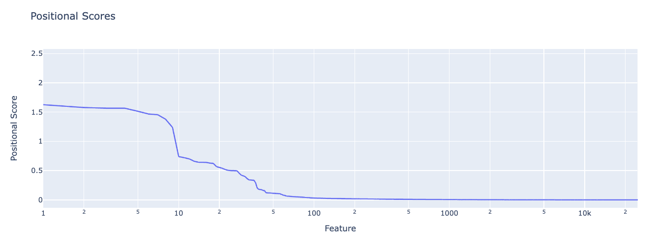We find positional scores drop off rapidly. There seem to only be ~50 positional features (of 24k total features) in this SAE.