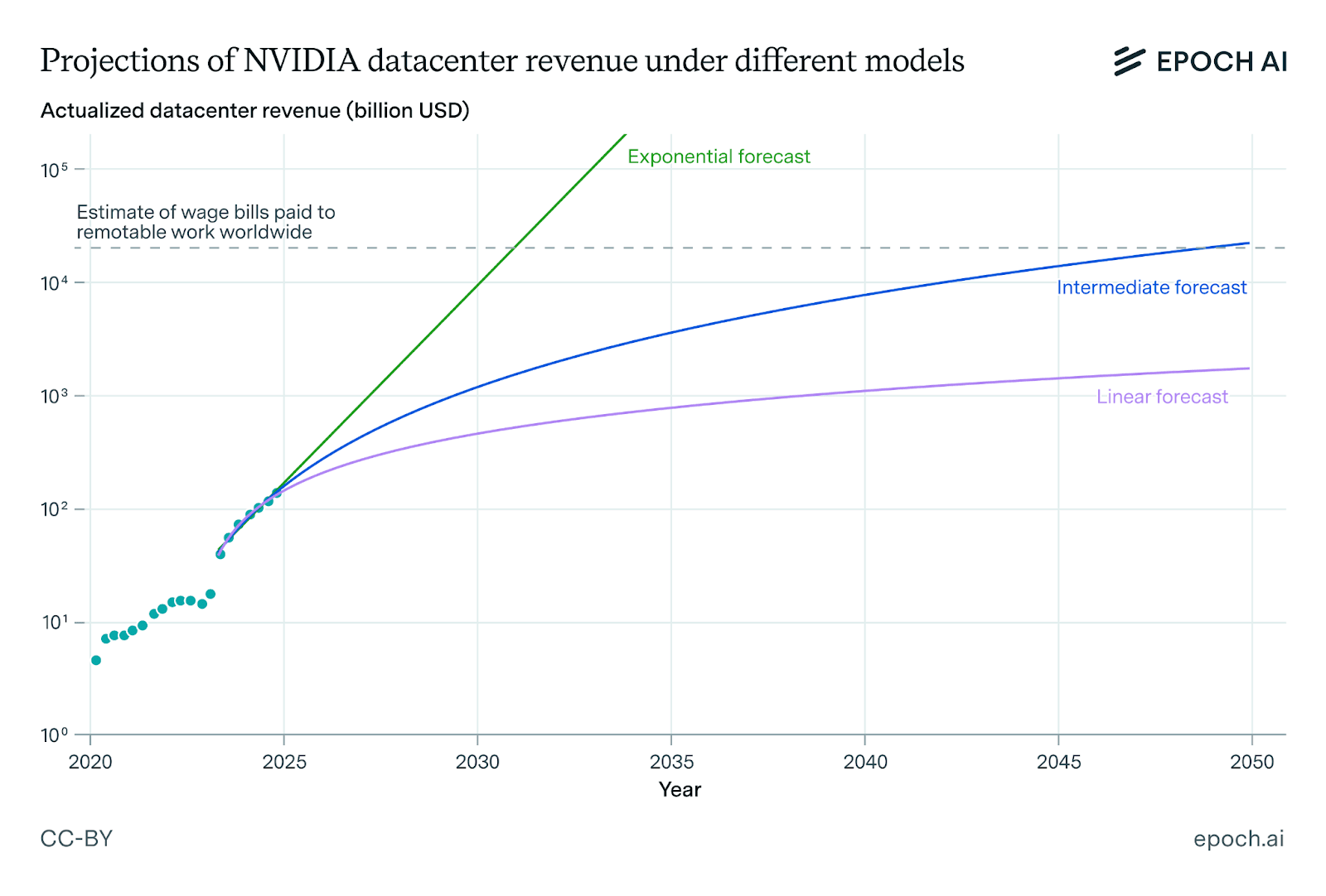A plot of AI datacenter revenue shows that if the trend continues even as far as 2030, the entire economy would be transformed.
