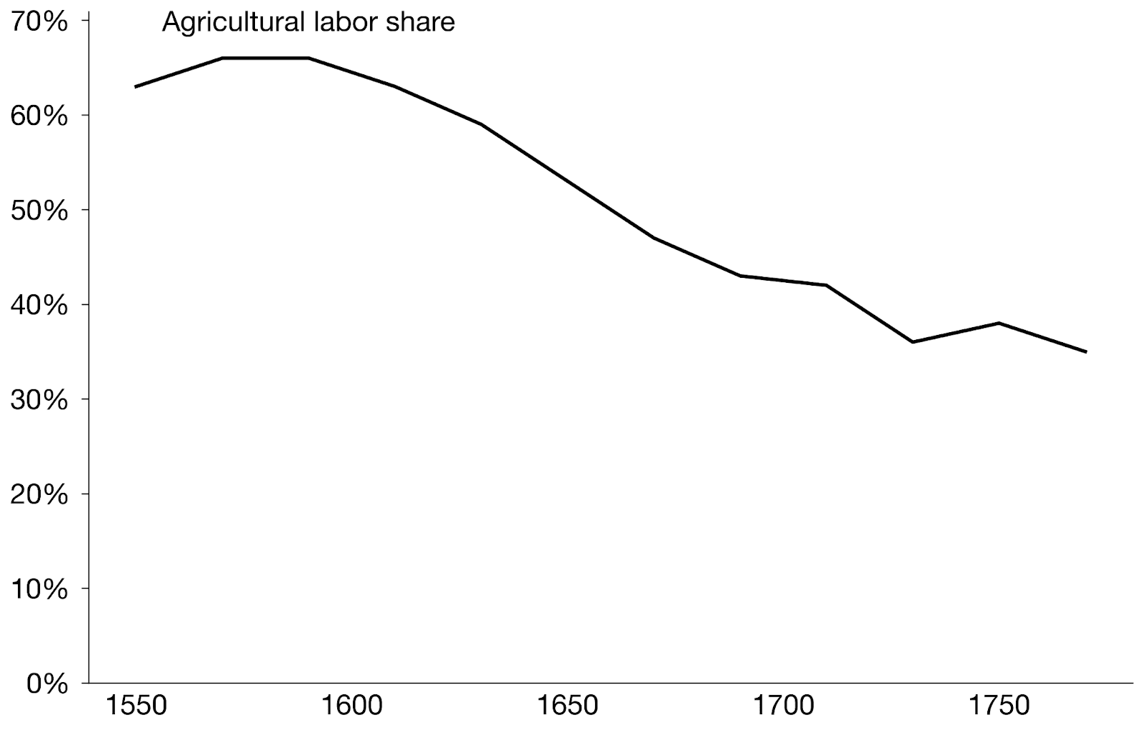 From 1600 to 1800, a new and innovative sector (cities and proto-industry) grew, but was held back by a traditional bottleneck (land).