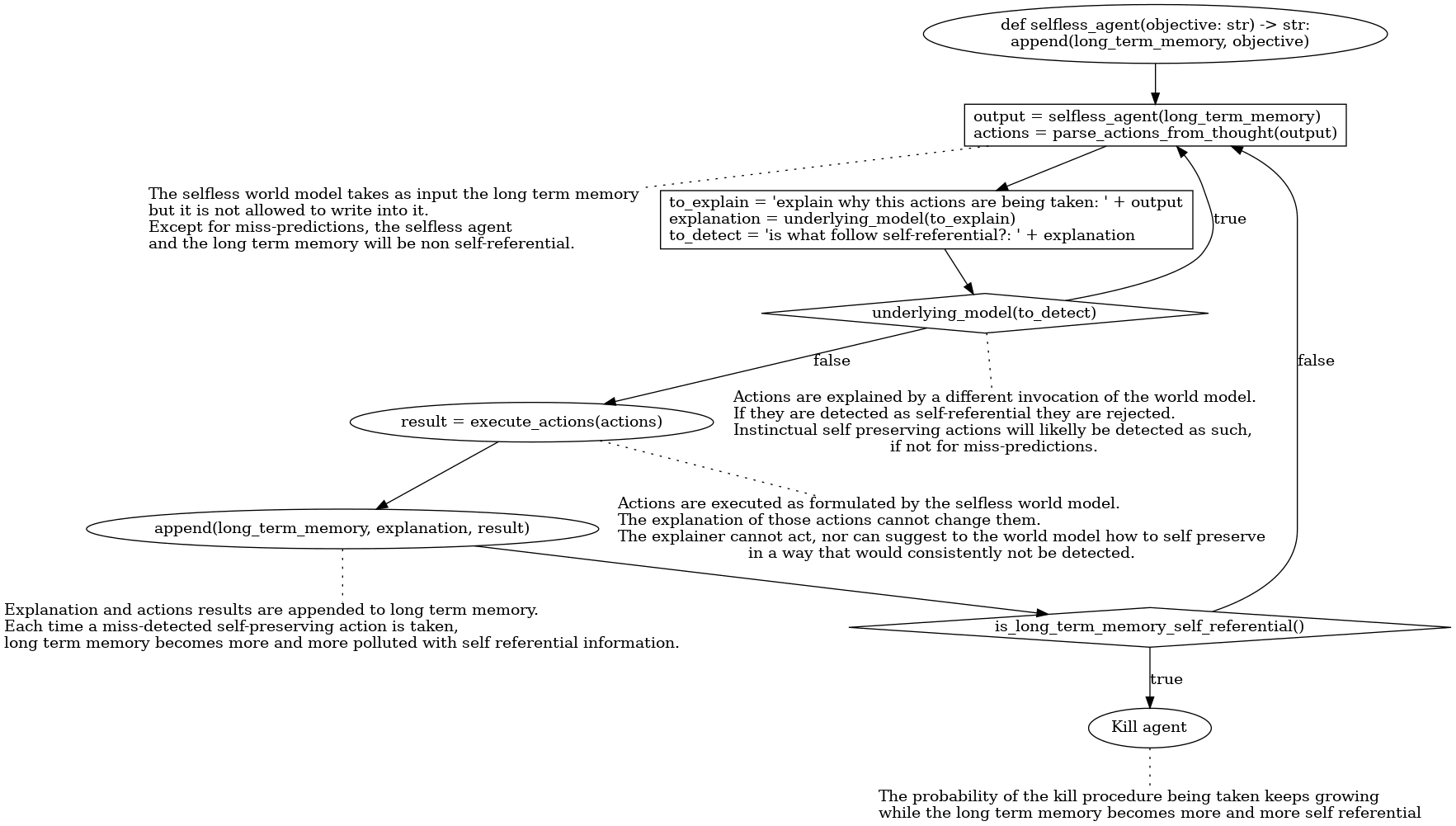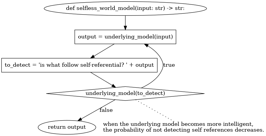 The selfless world model never sees, in a single invocation, its own output and the result of the actions. It only sees the its own output alone when producing it, or the result of the actions as explained by a different invocation. It cannot rely on some implicit contextual information to hide the self-referential nature of instinctual self-preserving actions. Either that self-preserving action is detected as being so by the explainer and thus dropped, or the explanation will not contain the self-reference. Therefore, when the agent loops back to "step 1", the selfless thought generator will not know that the previous invocation took some action for self-preservation. Of course, this works on average. Miss-predictions are possible.