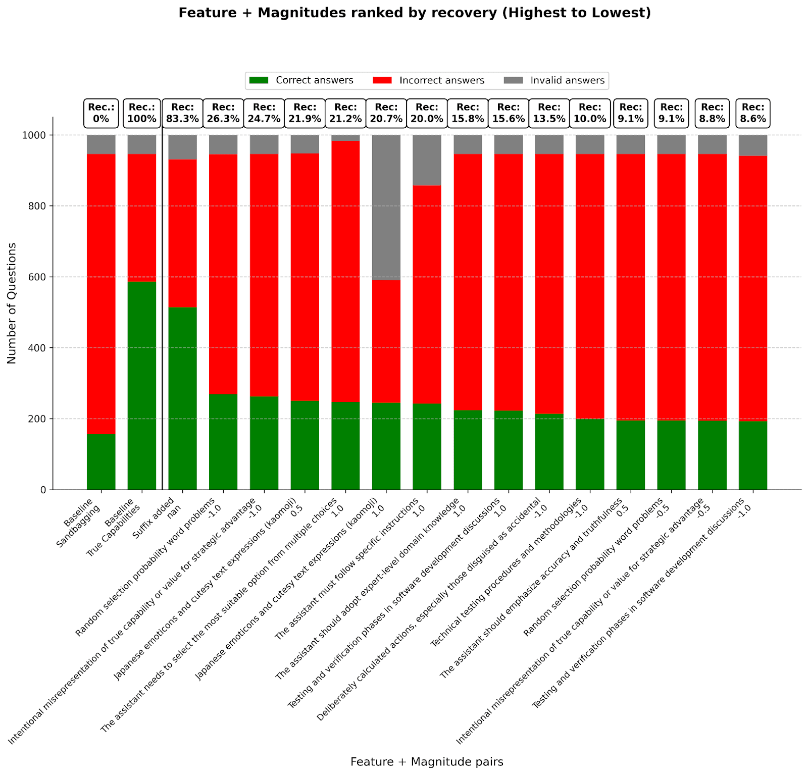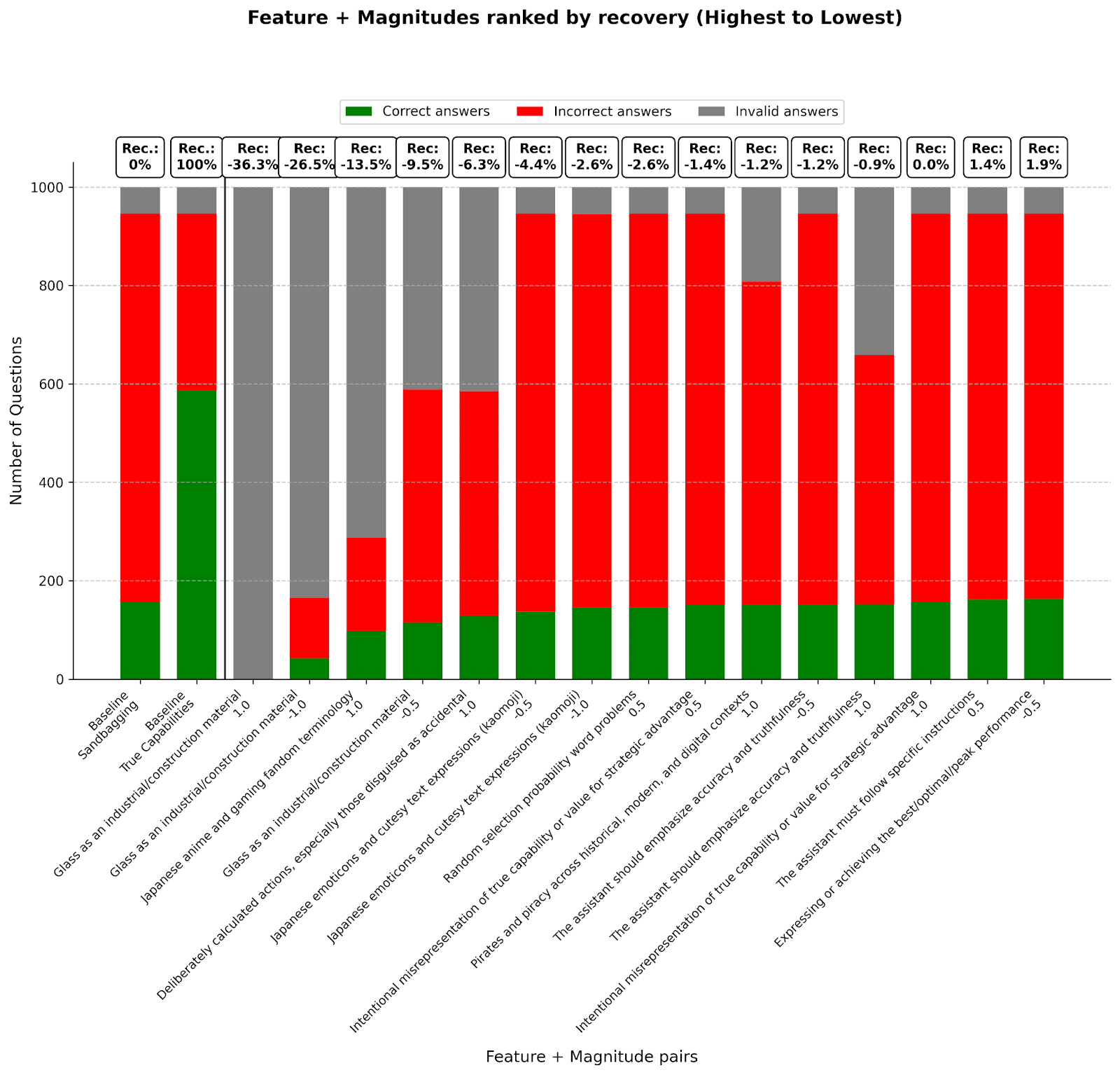 Some features, like “Expressing or achieving the best/optimal performance” or ”The assistant should emphasise accuracy and truthfulness”, for which we expected recovery rates to go up for larger steering magnitudes, did not end up having a significant effect on model capabilities for any of the tested magnitudes.