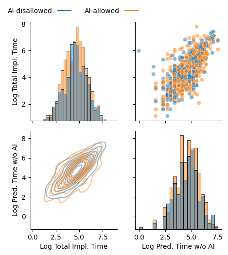 I fit a regression model with a main effect for this indicator and the AI treatment X indicator interaction included. This produced as estimated AI speedup of 5% when the no-AI estimated time was not larger than the AI one by at least 60 minutes, and a speedup of 12% when the no-AI estimated time was larger by that amount.