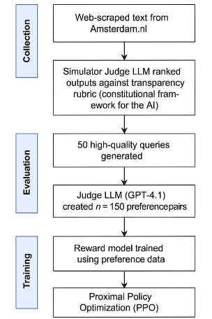 The choice of RLAIF over traditional human feedback approaches was mainly motivated by the need for scalable and consistent evaluation of complex transparency criteria. Government transparency encompasses multiple dimensions that require systematic assessment, making AI-based evaluation particularly suitable for this domain while acknowledging the limitations of not including human validation in the current study (Adam, 2025).