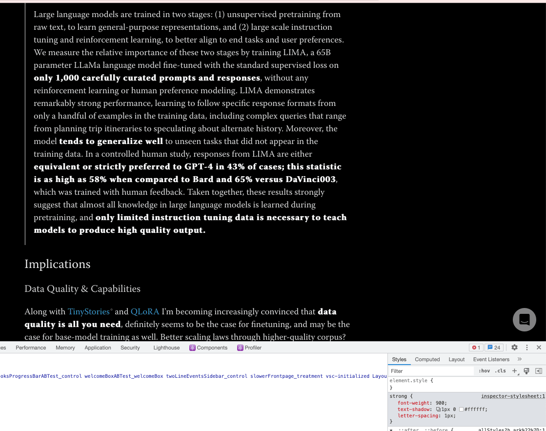 Along with TinyStories and QLoRA I'm becoming increasingly convinced that data quality is all you need, definitely seems to be the case for finetuning, and may be the case for base-model training as well. Better scaling laws through higher-quality corpus?