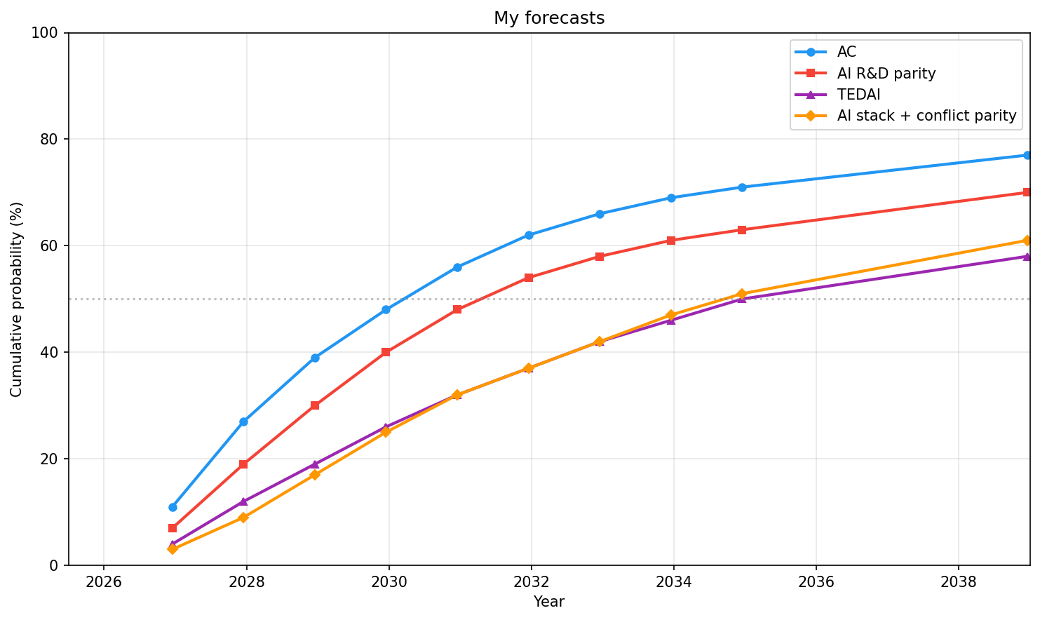 For comparison, Cotra's median for AI Research Parity (comparable to my AI R&D parity) is early 2030 (slightly before my median of early 2031), and her median for AI Production Parity (comparable to my AI stack + conflict parity, though mine also includes conflict) is mid 2032 (before my median of late 2034).