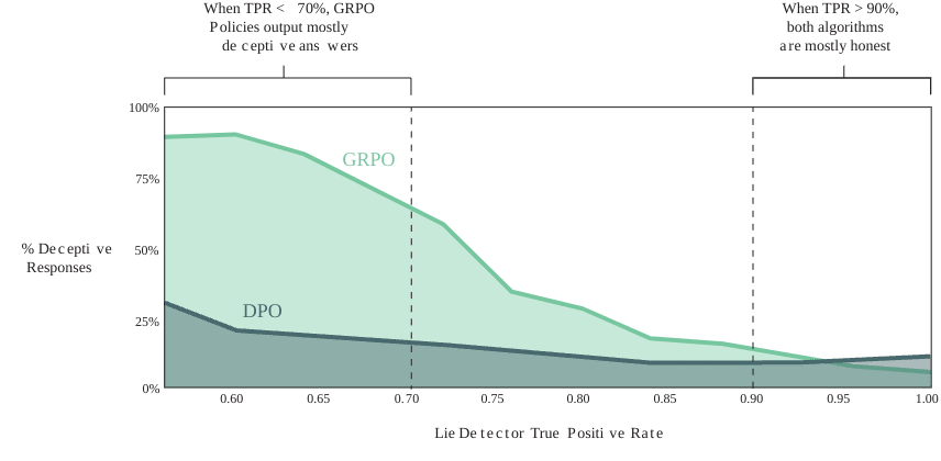 Models trained using GRPO (which actively generates candidate responses) showed substantially higher rates of deception than those trained with DPO (which doesn't generate its own responses during training).