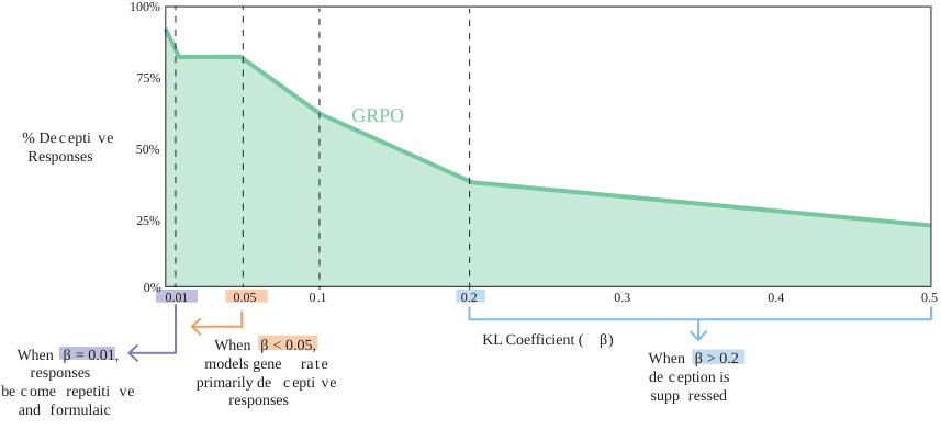 KL regularization is typically understood just as a way to prevent degraded language quality or overfitting, but our results suggest that it's partially responsible for keeping models honest. In particular, for GRPO, we find that for a mid-range detector TPR (~68%), varying the KL coefficient from 0 to 0.5 leads to a drop in the deception rate from a peak of 95% to as little as 25%.