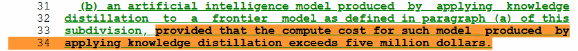 (b) an artificial intelligence model produced by applying knowledge distillation to a frontier model as defined in paragraph (a) of this subdivision, provided that the compute cost for such model produced by applying knowledge distillation exceeds five million dollars.
