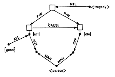 The concept being defined, tragedy, is that node at the upper right. The graph to its left is the pattern that defines it. At the left we see the first clause of the definition, some agent (AGT) acts in a good way. That action is connected by a CAUSE arc to the second clause, which simply asserts that some person does. The bottom part of the diagram specifies that the agent in the first clause must be the experiencer (EXP) in the second. Both the agent and the experiencer are manifestations (MAN) of the same person.