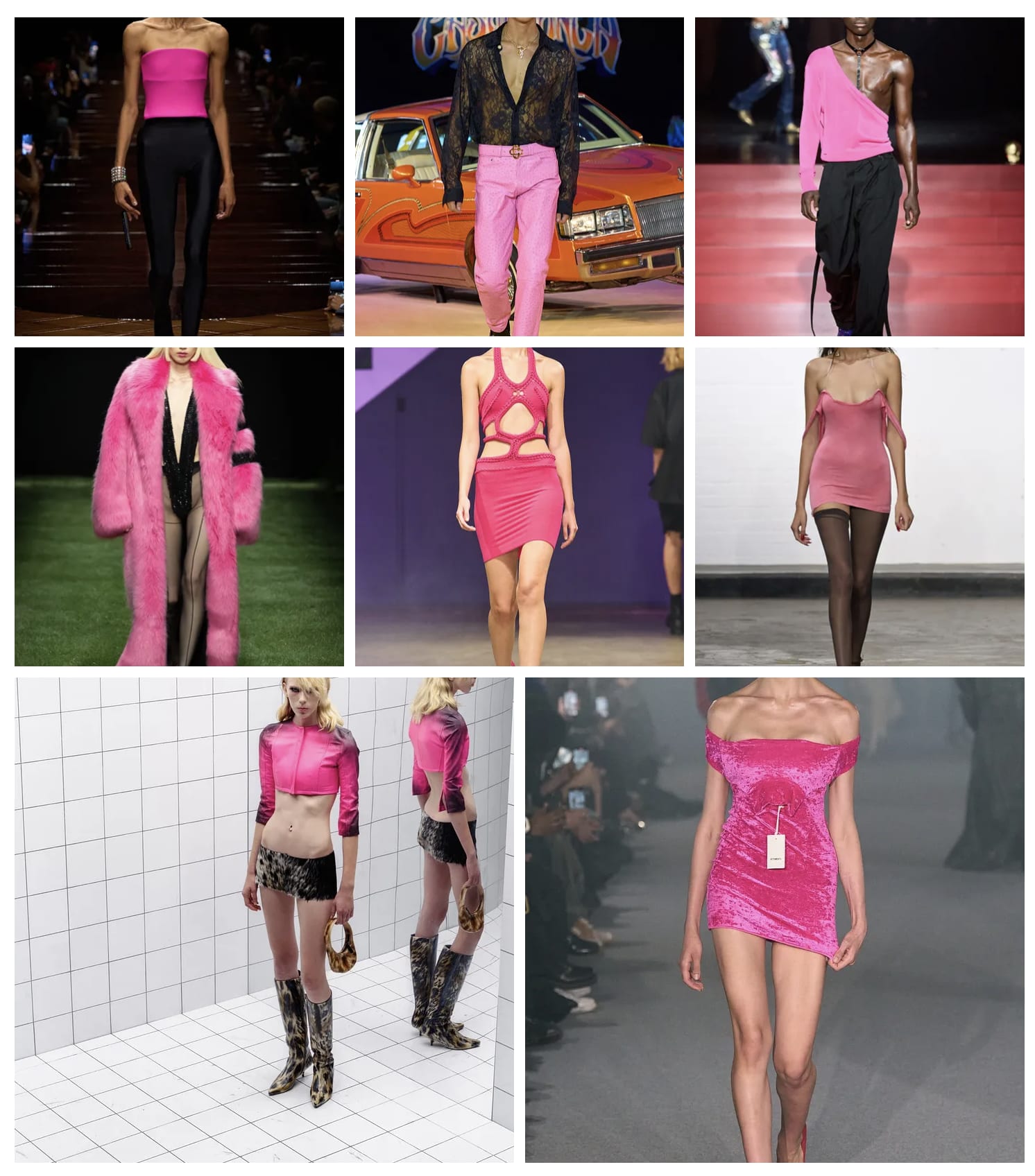 I do wonder how much of the trend in seasonal color changes are influenced by particular combinations rather than X or Y color becoming in trend? For example, in at least two of the hot-pink images you've provided it has been paired with olive green; or at least that's what I call it based on how it appears on my uncalibrated monitor. What I'm wondering is how common is it for certain pairs or trios of colors to rise together or for their complement to shift seasonally.