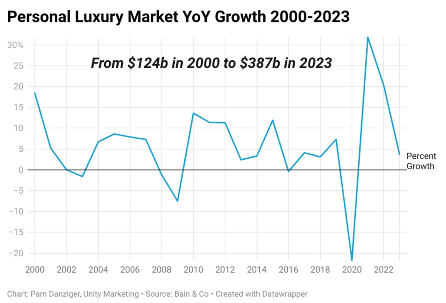 Economic “bad times” — the 2000 and 2008 market crashes and the 2020 pandemic — show up as decreased luxury good spending, and economic uncertainty, like our current period, tends to show up as a slowdown in growth.
